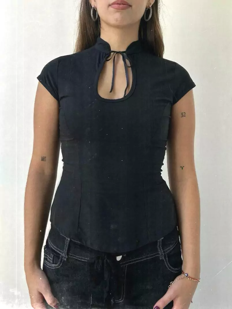Top cuello mao con escote en forma de gota. Tela camisera, rigida.